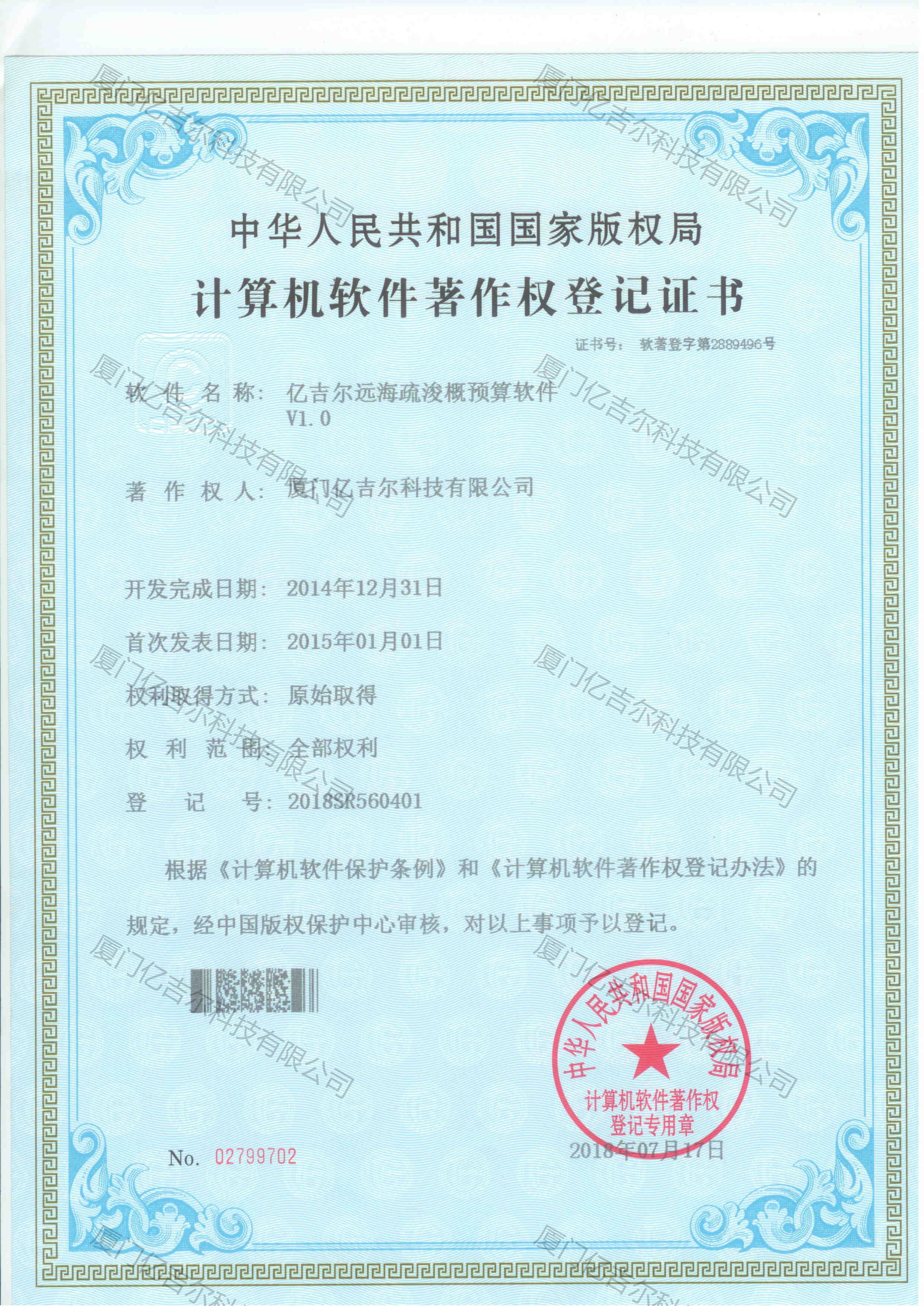 億吉爾遠(yuǎn)海疏浚概預(yù)算軟件著作權(quán)登記證書 發(fā)布日期:2018年07月17日 瀏覽次數(shù):3063 關(guān)鍵字: 公司 1/1億吉爾遠(yuǎn)海疏浚概預(yù)算軟件著作權(quán)登記證書